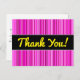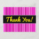 This postcard design features a pattern of thin stripes coloured various shades of colours like magenta and pink. It also features the message "Thank You!" on the front in yellow script-like text, along with a personalised message of gratitude on the back.