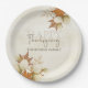 This design features thanksgiving elegant fall autumn leaves, botanical greenery fall foliage, thanksgiving fall autumn paper plate, thanksgiving fall autumn party supplies, modern calligraphy script typography, thanksgiving fall autumn tableware table, a fall autumn maple tree leaves, harvest family get together, a happy thanksgiving quote saying, thanksgiving table décor