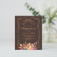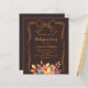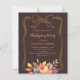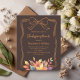 A bistre, dark brown coloured background. Decorated with muted coloured fall leaves and a hand-drawn bow. Personalise and add the party details.
