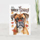A maple leaf sits on the nose of this adorable Boxer dog with autumn falling all around him/her and pairs with a fun Thanksgiving message for family and friends of the Boxer breed.