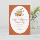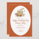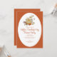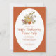 A Thanksgiving Day Dinner Party Invitation designed with autumn coloured leaves and a watercolor pumpkin, on a bright orange and white background with invitation text: Date, Time and RSVP Details. The reverse side in matching harvest orange colour. To personalise, simply replace the sample text using our step-by-step template.