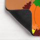 This mouse pad has a Thanksgiving design of a pumpkin with a pile of leaves and falling leaves and reminds people to give thanks.