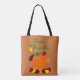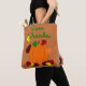 This tote bag has a Thanksgiving design with a pumpkin with a pile of leaves and falling leaves and reminds people to give thanks.