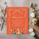 A pumpkin orange coloured background. Decorated with fall leaves and a hand-drawn bow. Personalise and add the party details.