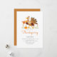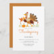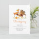 Celebrate the warmth and joy of Thanksgiving with our charming invitation card, perfect for gathering family and friends around the dinner table. This beautifully designed card features a delightful turkey illustration, surrounded by autumn leaves and pumpkins, capturing the spirit of the season.