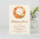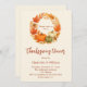 A warm, soft beige background. Decorated with fall themed wreath with orange foliage and pumpkins. . With the text: Thanksgiving Dinner written with a modern hand lettered style script. Personalise and add the details.