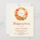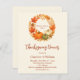 A warm, soft beige background. Decorated with fall themed wreath with orange foliage and pumpkins. . With the text: Thanksgiving Dinner written with a modern hand lettered style script. Personalise and add the details.