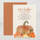 Thanksgiving dinner invitation for friends and/or family. Orange pumpkin and glittery gold fall leaves with text, "Let's gather and give thanks." Add your dinner and location information to this beautiful card.