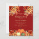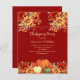 A terracotta, brown coloured background. Decorated with pumpkins and orange and yellow flowers. Personalise and add the party details.