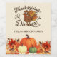A beige, cream coloured background. A cute turkey and orange and yellow fall flowers and orange, white and green pumpkins. Personalise and add your family name.