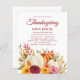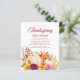 Thanksgiving dinner open-house invitation on budget paper. Cheerful fall flowers and autumn leaves with boho watercolor pumpkins and script text in festive colours. Click Customise to change the text, colours, or background.