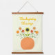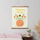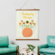 This awesome Thanksgiving wood topped hanging tapestry features a digital art image of a floral arrangement of pretty flowers inside an orange coloured pumpkin vase. The centrepiece of the bouquet is a beautiful big yellow sunflower with large pale green leaves. Either side of the sunflower are a selection of other blooms including red rudbeckia, pale peach coloured Zinnias and pretty orange and yellow bicoloured Gaillardia. All flowers are supported by their green stems and leaves. The petal colours are designed to match the colours of fall. There is custom text so you can personalise this design with a message.