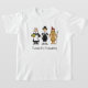 Three children in Colonial era costumes join hands on this Thanksgiving t shirt image in celebration of the first Thanksgiving to be held by European colonists on American soil. The pilgrim colony girl holds a bowl of corn and wears a bonnet and apron, the pilgrim boy has a black hat and black jacket and knee breeches, and the Native American girl is dressed up in an American Indian inspired outfit with feather headress and fringed dress. The customisable slogan "Thanks For Friendship" can be changed to words of your own choice. This Thanksgiving Friendship design is available on the full range of t shirts and other wearables for kids, babies, and adults.