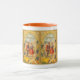 Beautiful Thanksgiving coffee mug showing the plentiful harvest with grateful Pilgrims bowing their heads in prayers of Thanksgiving. This image is vivid and bright with a dark framing background. It is from a 1911 Thanksgiving image that we have restored.