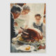 This image depicts a classic Thanksgiving scene reminiscent of vintage illustrations. It features a family gathered around a dinner table, joyfully watching as an older man carves a large, golden-brown roasted turkey. The warm light pouring through the window illuminates the family members' faces, highlighting their happiness and anticipation. The table is elegantly set with a bountiful feast, including grapes and decorative garnishes surrounding the turkey. The overall atmosphere evokes a sense of nostalgia, warmth, and celebration.