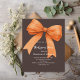 A bistre, dark brown coloured background. Decorated with a larage orange bow. Personalise and add the party details.