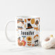 A mug with a seasonal Thanksgiving pattern. Featuring whimsical pilgrims, turkeys, pumpkin pie and other various autumn themed elements.