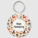 Key chain with a seasonal Thanksgiving pattern. Featuring whimsical pilgrims, turkeys, pumpkin pie and other various autumn themed elements.