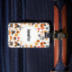 A luggage tag with a seasonal Thanksgiving pattern. Featuring whimsical pilgrims, turkeys, pumpkin pie and other various autumn themed elements.