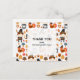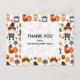 Thank you postcard with a seasonal Thanksgiving pattern. Featuring whimsical pilgrims, turkeys, pumpkin pie and other various autumn themed elements.