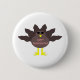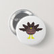 This button features a cartoon of a turkey with big black eyes, a small yellow beak and tail feathers sticking up. The feet are facing in opposite directions making the turkey look goofy. The turkey has pink text on its’ belly that says “Happy Thanksgiving” and it looks like the feathers have been plucked out to reveal the message.