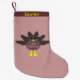This awesome Christmas stocking features a cartoon of a turkey with big black eyes, a small yellow beak and tail feathers sticking up. The feet are facing in opposite directions making the turkey look goofy. The turkey has pink text on its’ belly that says “Happy Thanksgiving” and it looks like the feathers have been plucked out to reveal the message. There is customisable text at the top of the stocking so it can be personalised.