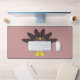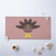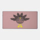 This awesome desk mat features a cartoon of a turkey with big black eyes, a small yellow beak and tail feathers sticking up. The feet are facing in opposite directions making the turkey look goofy. The turkey has pink text on its’ belly that says “Happy Thanksgiving” and it looks like the feathers have been plucked out to reveal the message.
