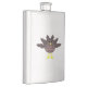 This awesome flask features a cartoon of a turkey with big black eyes, a small yellow beak and tail feathers sticking up. The feet are facing in opposite directions making the turkey look goofy. The turkey has pink text on its’ belly that says “Happy Thanksgiving” and it looks like the feathers have been plucked out to reveal the message.