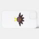 This awesome iPhone case features a cartoon of a turkey with big black eyes, a small yellow beak and tail feathers sticking up. The feet are facing in opposite directions making the turkey look goofy. The turkey has pink text on its’ belly that says “Happy Thanksgiving” and it looks like the feathers have been plucked out to reveal the message.