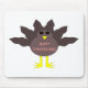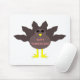 This mousepad features a cartoon of a turkey with big black eyes, a small yellow beak and tail feathers sticking up. The feet are facing in opposite directions making the turkey look goofy. The turkey has pink text on its’ belly that says “Happy Thanksgiving” and it looks like the feathers have been plucked out to reveal the message.