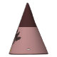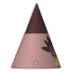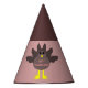 This awesome party hat features a cartoon of a turkey with big black eyes, a small yellow beak and tail feathers sticking up. The feet are facing in opposite directions making the turkey look goofy. The turkey has pink text on its’ belly that says “Happy Thanksgiving” and it looks like the feathers have been plucked out to reveal the message.
