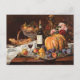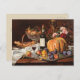 There is a bottle and a glass of red wine, a pumpkin and some plums, pears and peaches, and, in the background, roses and ladyfinger biscuits.