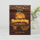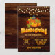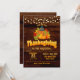 Thanksgiving invitation with party lights, pumpkins, pilgrim hats, and autumn leaves on a dark wood background with bright text.