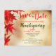 This early Thanksgiving dinner save the date invitation features fall leaves along the left border on the front with a similar design on the back. Personalise the text in the template fields on the front and back or click customise to select a font style, size, and colour you prefer.