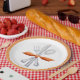 These paper plates have a watercolor painting of silverware tied with an orange bow. There is an orange and white polka dot border on a white background. Colours used include orange, grey and white.