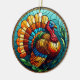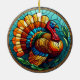 Thanksgiving themed ornament in a faux stained glass style featuring a beautiful orange and brown turkey with a teal background.