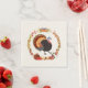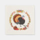 A colourful turkey bird displays its plume. Fall leaves and a bountiful harvest adorn the scene.