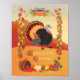 A colourful turkey bird displays its plume. Fall leaves and a bountiful harvest adorn the scene.
