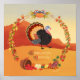 A colourful turkey bird displays its plume. Fall leaves and a bountiful harvest adorn the scene.