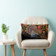 This throw pillow is shown with a autumn fall leaves and a Thanksgiving turkey print on a black colour background.