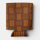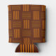 This can cooler has a mid-century modern design that looks like a weave with orange and brown lines on a field of darker brown.
