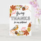 Giving Thanks, Thanksgiving greeting card for a wonderful girlfriend. Customise the front of the card as you like. Fall autumn themed wreath design with a variety of leaves, acorns, berries, and a bird. Design copyright © Shoaff Ballanger Studios, 2022.