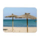 Thatch beach umbrellas, sand, blue ocean and sky, painting effect
