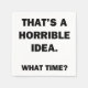 For the sarcasm lover in all of us. Check out this witty “That’s a Horrible Idea. What Time?” design on apparel and gifts.