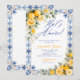 An elegant That’s Amore bridal shower invitation featuring a fresh watercolor lemon and yellow floral design framed with a classic blue Italian tile pattern. Inspired by Italian-themed bridal showers, this invitation combines bright citrus elements with soft yellow florals and timeless Mediterranean tile details for a romantic and stylish look.