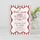 The design features a bold red background that evokes the heart and passion of Italy, paired with whimsical, hand-drawn illustrations — think bubbly wine glasses, fresh pizza slices, olive branches, and cosy candlelight. It’s a celebration of love in its most joyful, down-to-earth form — perfect for brides who prefer laughter over lace and mozzarella over monograms.