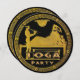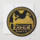 Round pearl shimmer invitation with an ancient Greek black and gold image of a man lounging and enjoying the musical talent of a young boy. The back is black with an ancient Greek gold border.