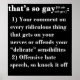 That's So Gay: 1. Your comments on every ridiculous thing that gets on your nerves or offends your "delicate" sensibilities 2. Offensive hate speech, so knock it off