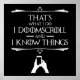 That's What I Do - I Doomscroll And I Know Things. This funny doomscroll design is a great gift for a man or woman who's a doomscroller. Doomscrolling is when you're constantly scrolling through your news apps and social media looking for bad news. This decade has been full of crisis, which can take a toll on your mental wellbeing. If you scroll through your news feed, reading and looking for news articles that give you anxiety, this accessory is probably for you!