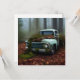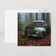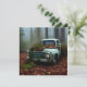 Cool flat greeting card for vintage truck lovers features an AI generated digital art painting of an abandoned vintage blue truck in a forest, now covered with moss and leaves. Blank on back and ready for your greeting, birthday wishes and more.